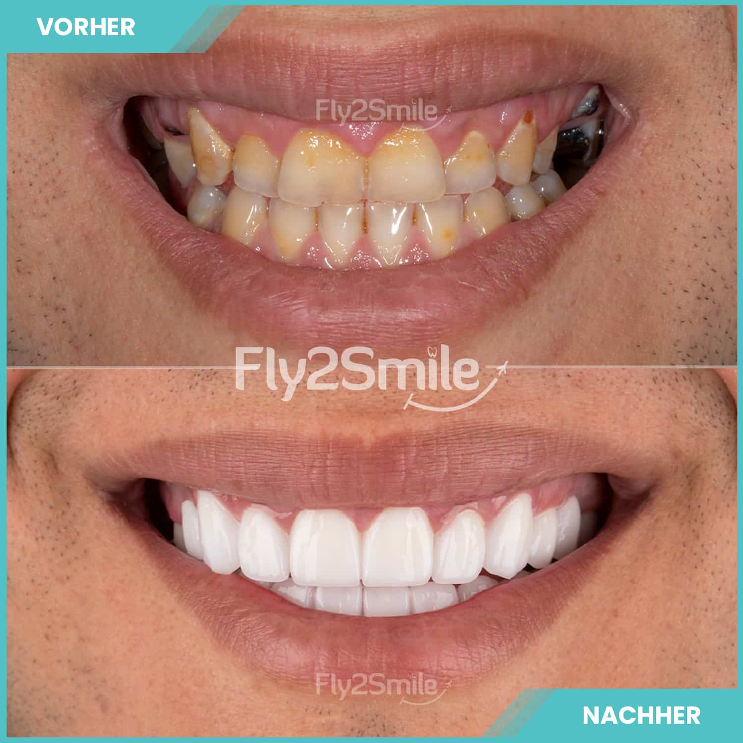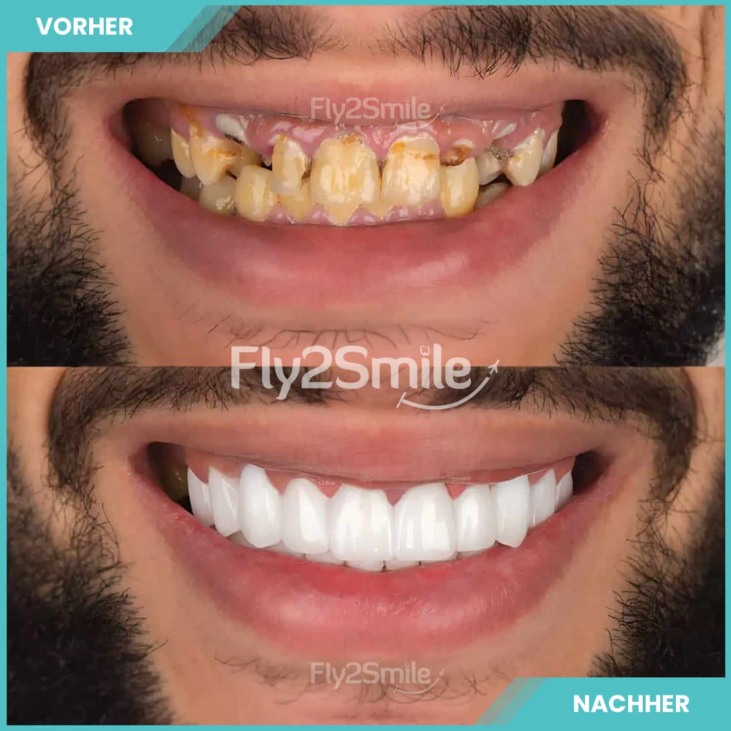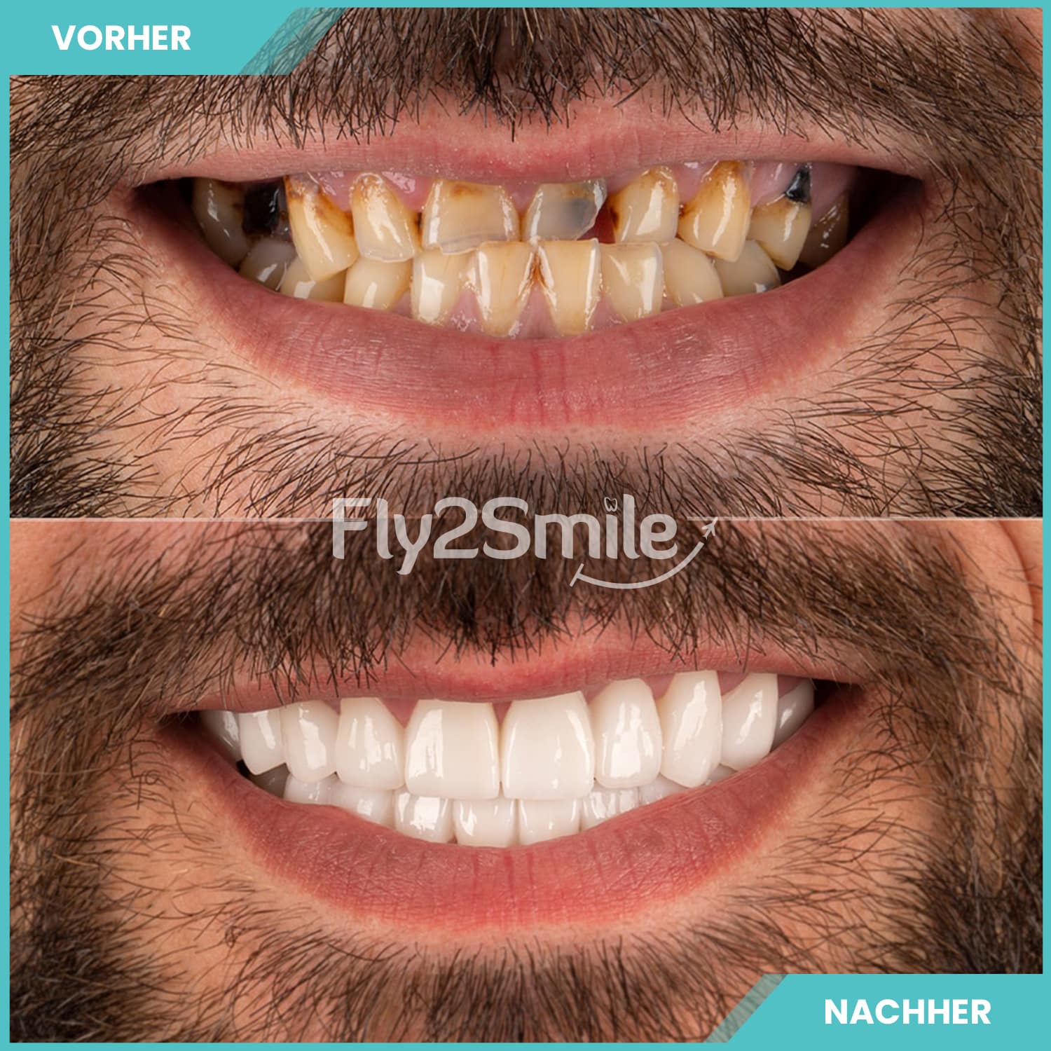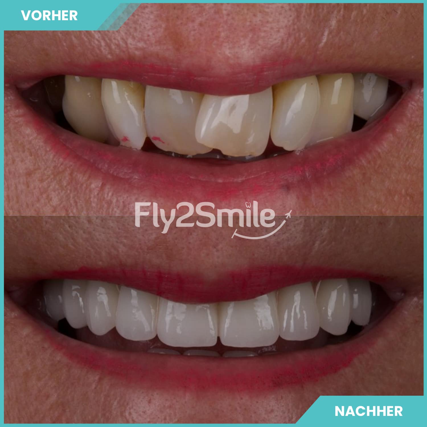 In der Regel reichen 3 bis 5 Tage vor Ort aus. In dieser Zeit werden die Zähne vorbereitet, Abdrücke genommen und die Kronen eingesetzt. Bei komplexeren Fällen kann ein zweiter, kürzerer Termin nötig sein.